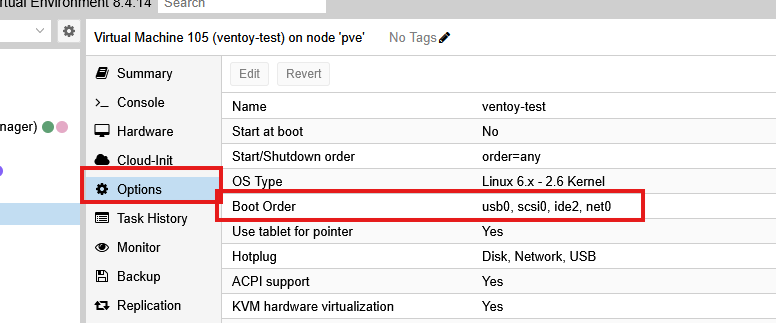 qm set 100 --delete usb0Set boot order: